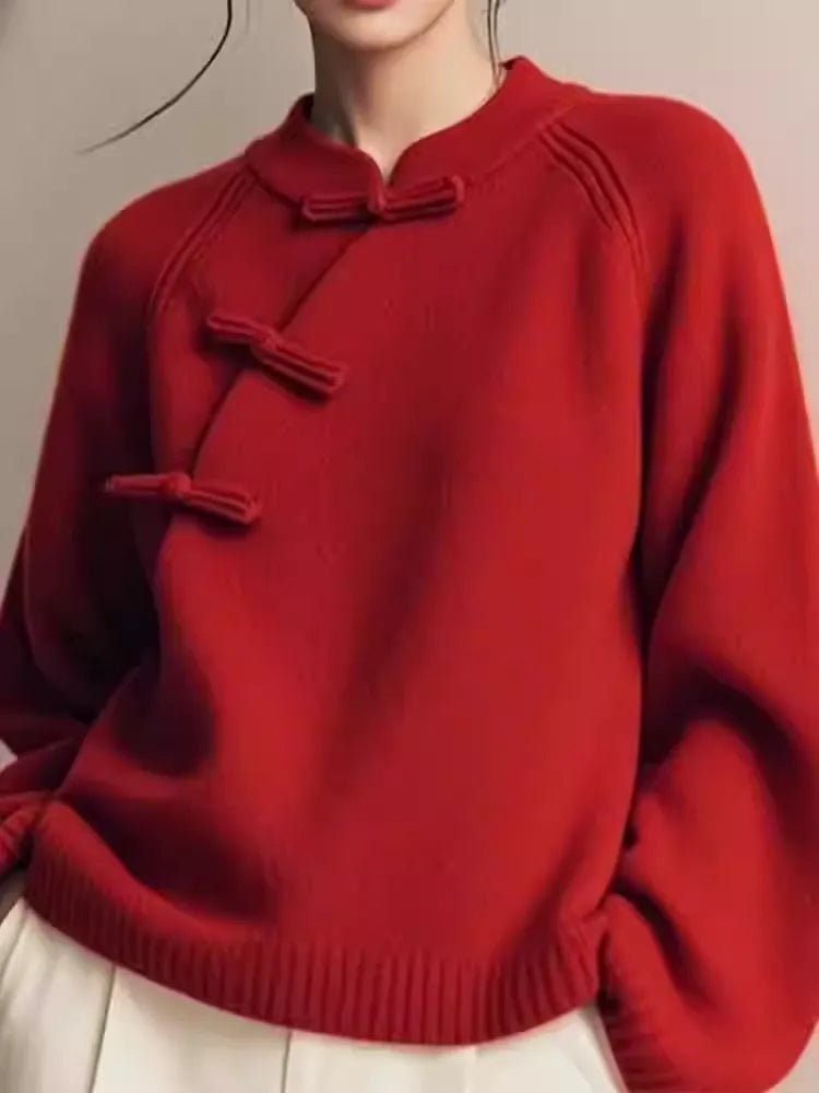 2026 Year of the Horse Red Mandarin Collar Frog Button New Chinese Sweater