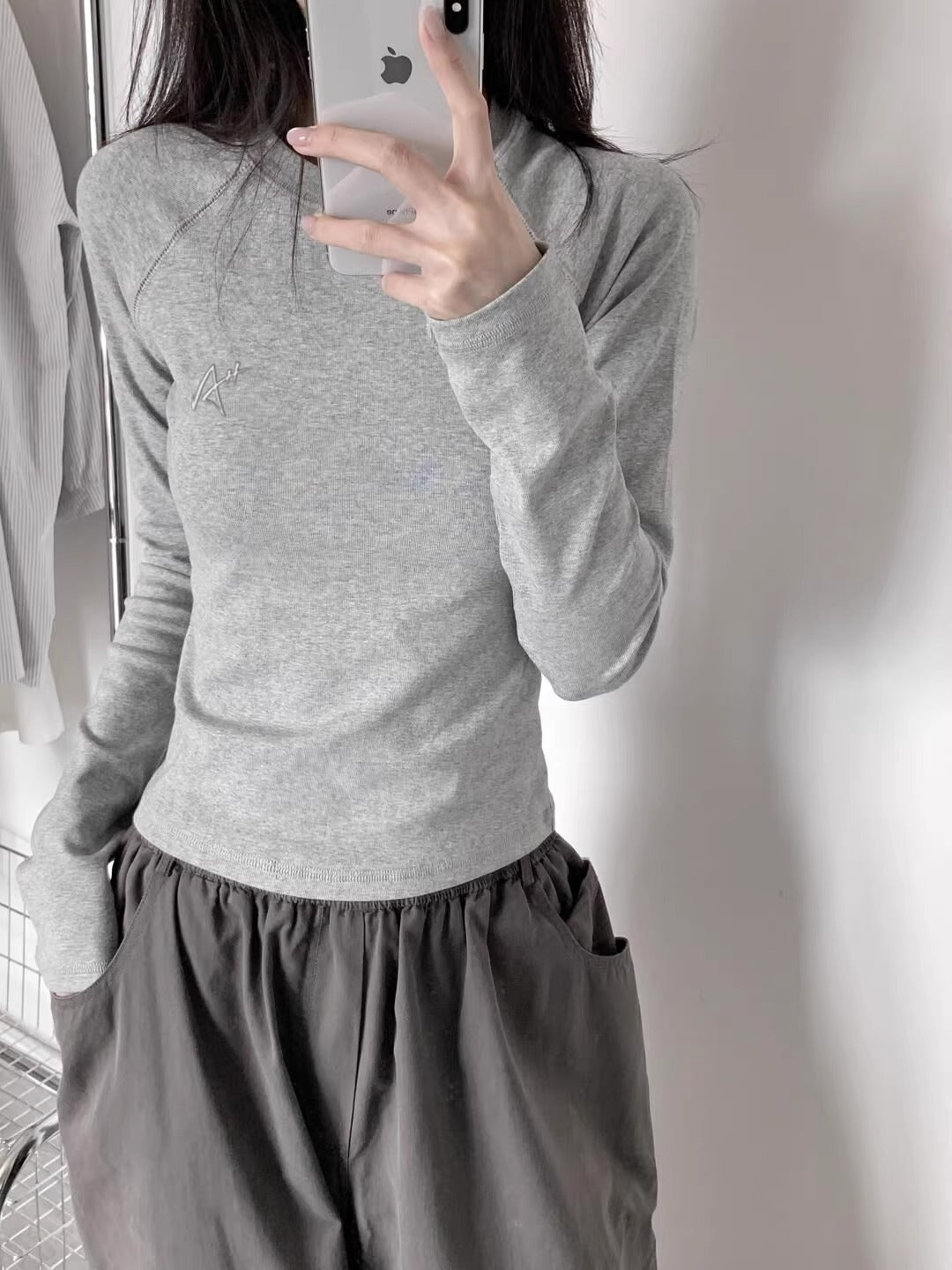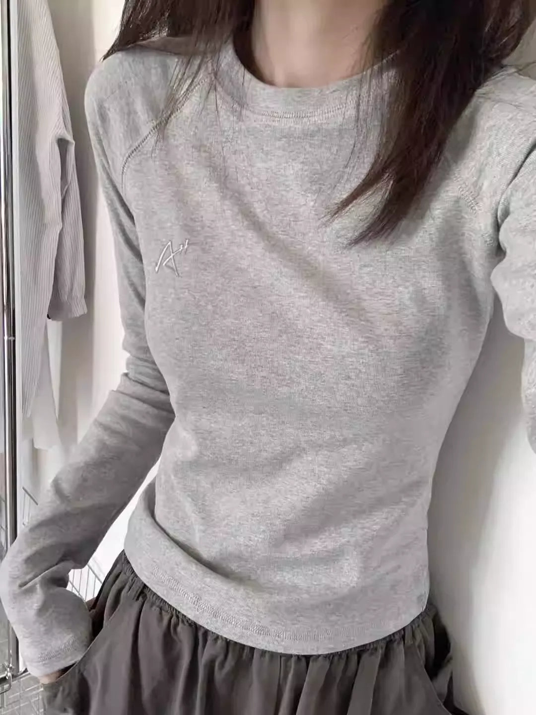 American Retro Embroidered Gray Slim Fitted Shoulder Brushed Top