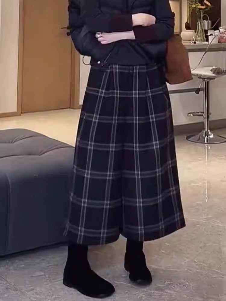 High Waist Black Plaid Wool Loose Wide Leg Cropped Trousers