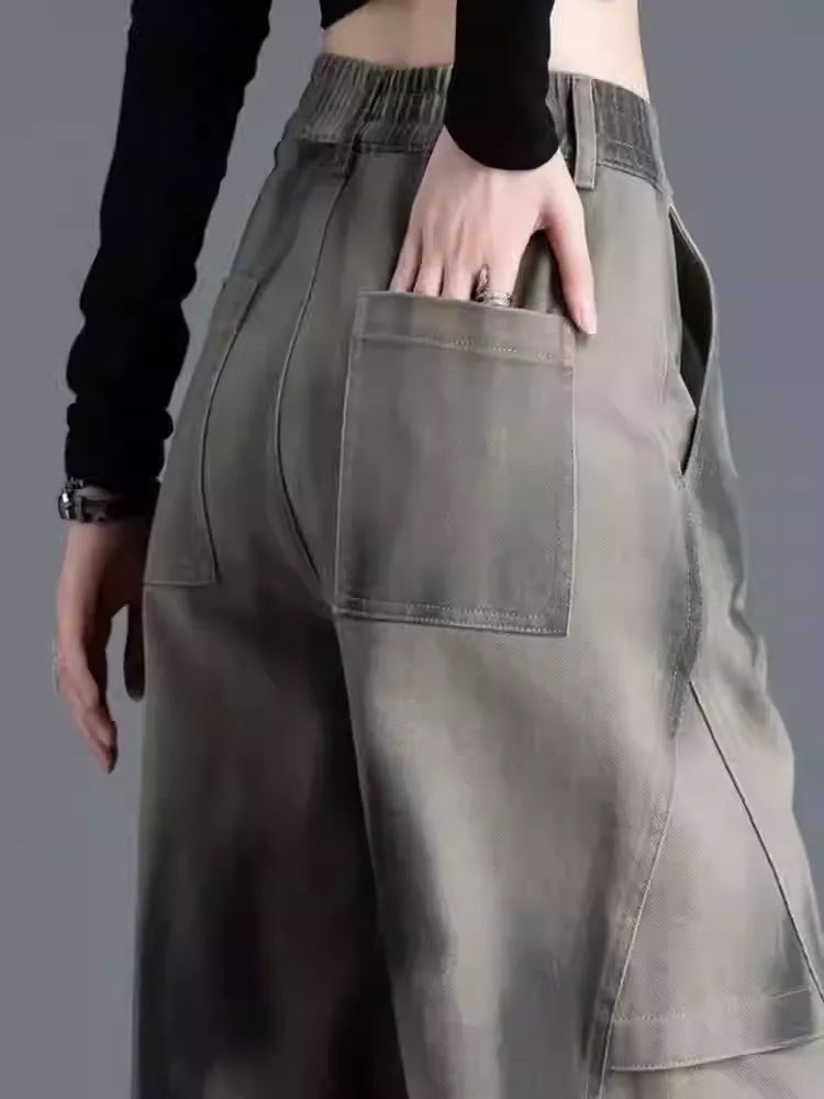 High Waist Tie Dye Curved Leg Cargo Jeans - Loose Fit