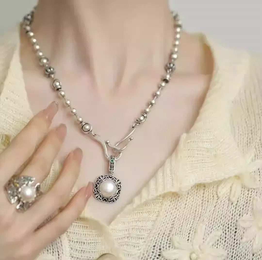 S925 Sterling Silver Vintage New Chinese Style Filigree Pearl Floral Pendant Necklace,
