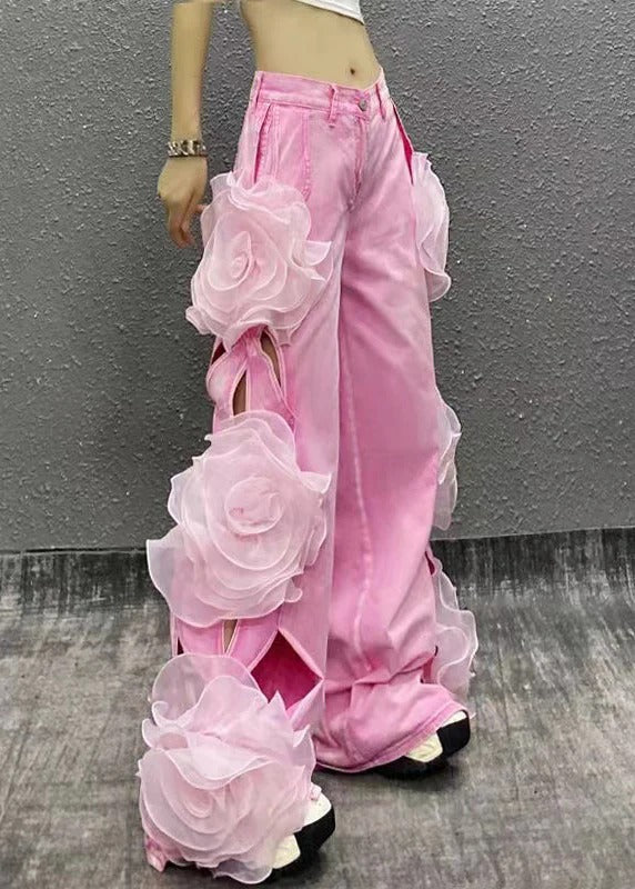 Original Design Blue Hollow Out Floral Denim Wide Leg Pants Fall