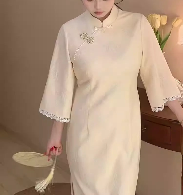 Plus Size Cream Yellow Lace Flared-Sleeve Retro Chinese Qipao