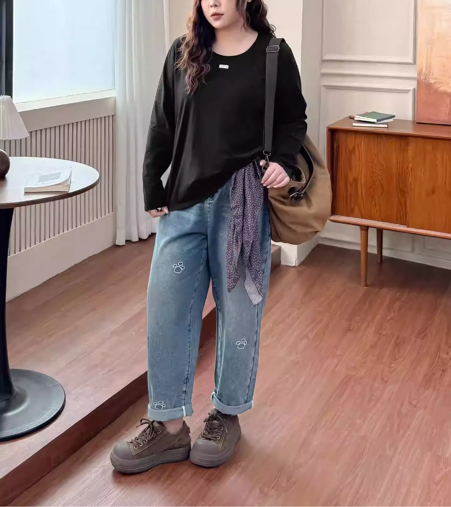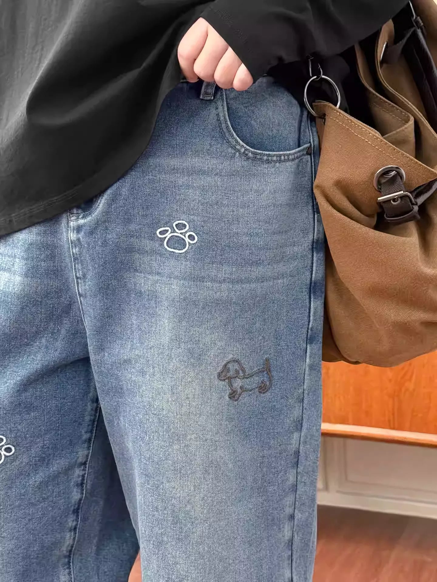 Plus Size Shaping Long Animal Embroidery Denim Wide-Leg Pants