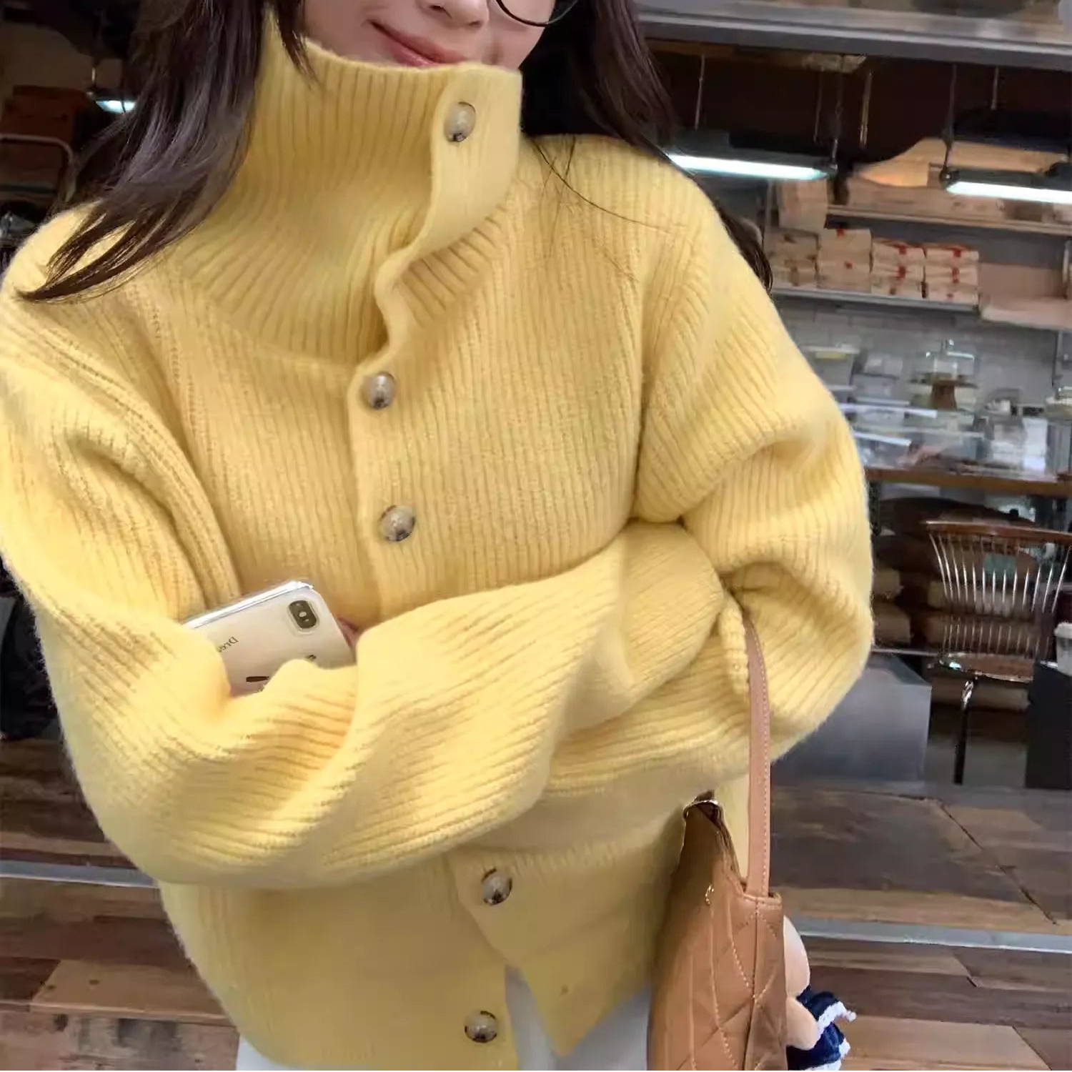 Retro Lapel Turtleneck Cardigan Women Loose Elegant Knit Outerwear Top