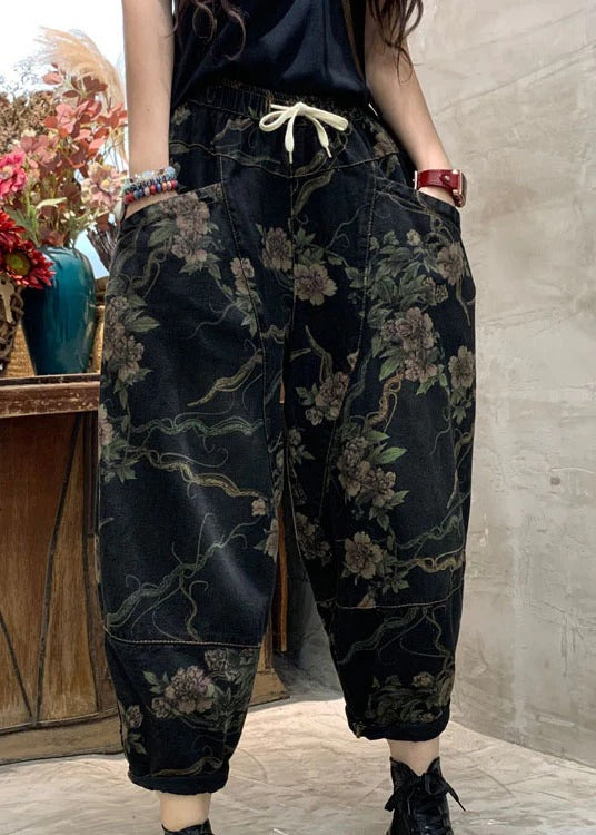 Unique Black retro Cinched Print denim Pants Trousers Spring